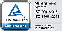 Die aktuellen Zertifikate zur ISO 9001 und ISO 14001 finden Sie in der Dateiliste rechts. Besuchen Sie auch die Seite der TÜV Rheinland Group: Certipedia - Zertifikatsdatenbank von TÜV Rheinland.