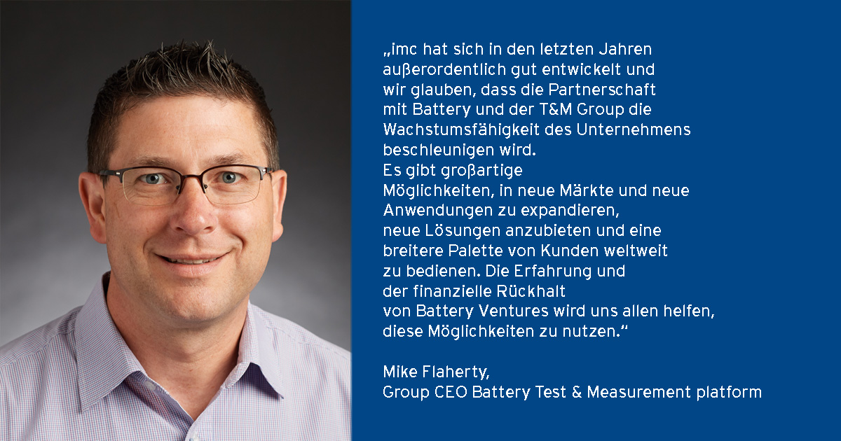 „imc hat sich in den letzten Jahren außerordentlich gut entwickelt und wir glauben, dass die Partnerschaft mit Battery und der T&M Group die Wachstumsfähigkeit des Unternehmens beschleunigen wird. Es gibt großartige Möglichkeiten, in neue Märkte und neue Anwendungen zu expandieren, neue Lösungen anzubieten und eine breitere Palette von Kunden weltweit zu bedienen. Die Erfahrung und der finanzielle Rückhalt von Battery Ventures wird uns allen helfen, diese Möglichkeiten zu nutzen.“