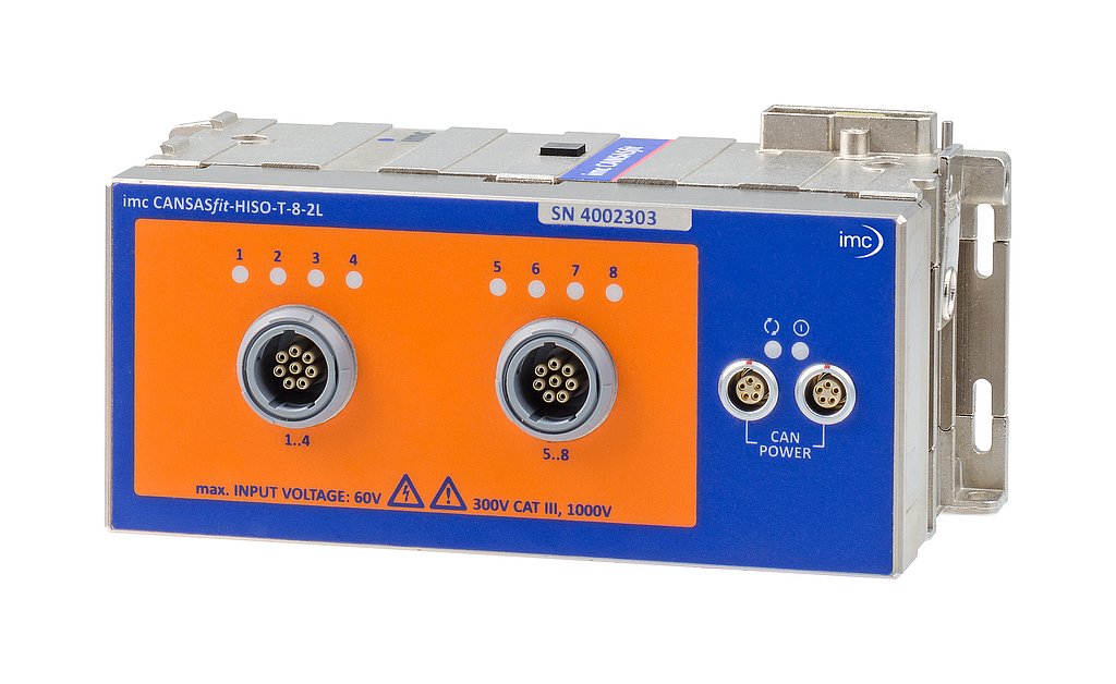 imc CANSASfit(CANFT) 모듈 시리즈 중 HISO 시리즈는 고전압 환경에서 사용이 가능하도록 특별히 설계된, 특히 높은 절연 측정을 제공합니다. 모델 T-8은 높은 공통 모드 전압(Common-mode voltage) 또는 최대 1000 V 전압의 환경에서 8개 채널의 열전대(유형 K) 온도 측정을 지원합니다.