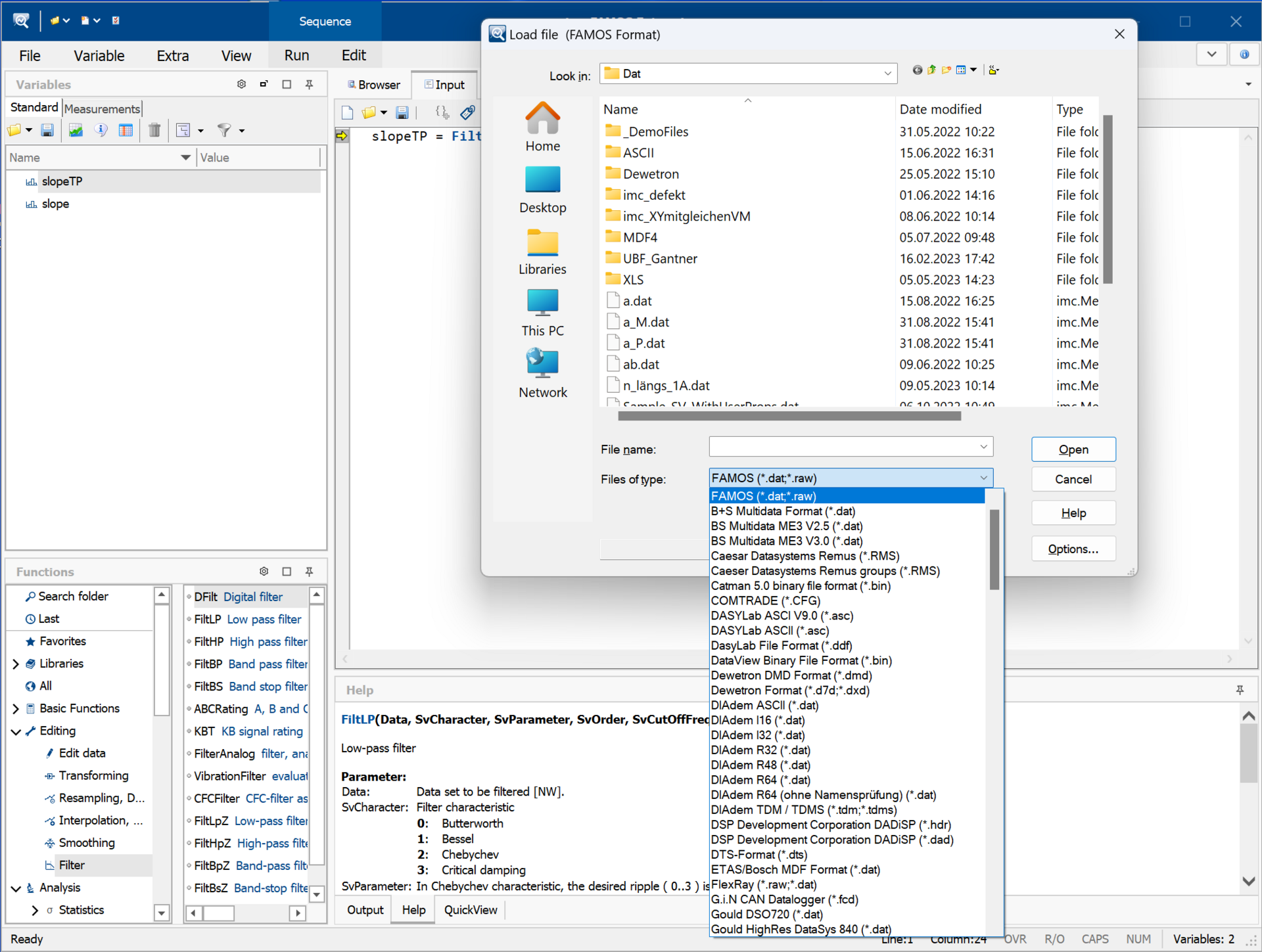 imc FAMOS unterstützt eine große Anzahl gängiger Datenformate wie MDF, CSV, Excel, WAV, Matlab u.v.m. Zahlreiche Datei-Importfilter erlauben ein direktes Einlesen unterschiedlichster Formate, ohne Genauigkeit oder Metadaten wie Einheiten zu verlieren.