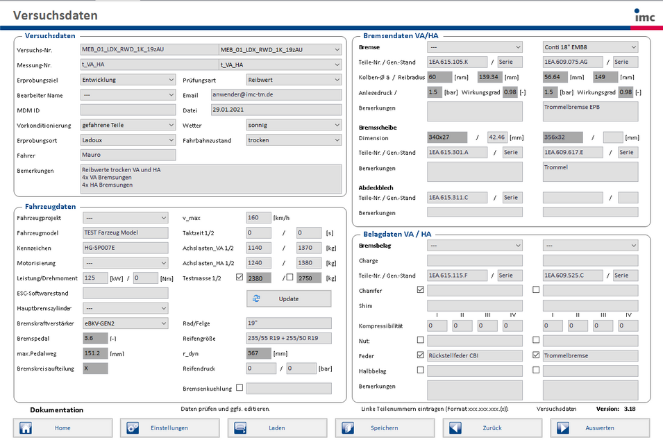 Das imc Bremsmesssystem ist eine umfassende Testlösung für Entwickler moderner KFZ-Bremssysteme. Es besteht aus einem modularen Datenerfassungssystem inklusive optionaler Sensorik und Radtelemetrie und einem Softwarepacket für alle gängigen Bremsentests. Es erfasst und verarbeitet alle relevanten Messgrößen wie Bremskraft, Pedalweg, Temperatursensoren, Innen- und Aussenschall (Mikrofone) wie auch Vibrationen. Ebenso können digitale Informationen beispielsweise der imc Radtelemetrie für Bremsscheibentempertaturen oder Informationen aus Feldbussen wie CAN, CAN FD, XCPoE, Flexray, etc. synchron erfasst werden. Die Tests werden in Anlehnung an internationale Normen wie ECE, ISO, FMSSV und SAE durchgeführt.